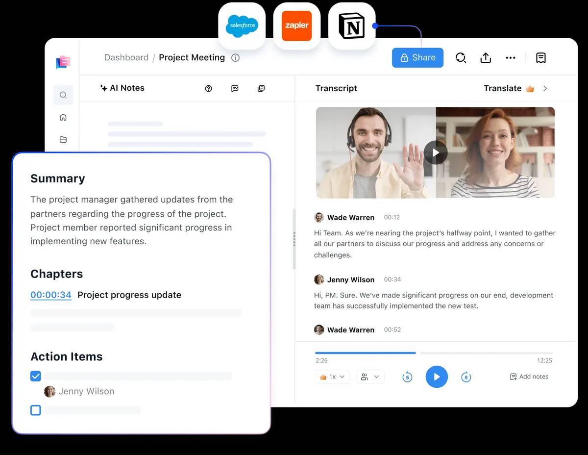 Platform integration: Zoom, Google Meet, Microsoft Teams, Webex, Salesforce, Slack, Notion, Google Calendar, plus 8,000+ apps via Zapier