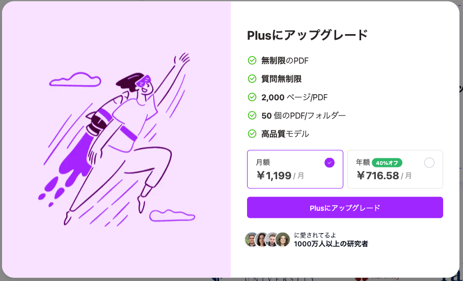 無料版は個人の軽量利用には十分ですが、ビジネス用途や大規模な文書処理には制限があります。Plus版は月額1199円で、無制限のファイル処理と質問回数を提供し、コストパフォーマンスは良好です。
