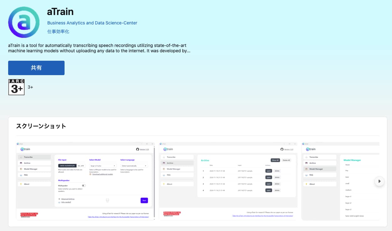 aTrainは、音声ファイルをローカル環境で自動文字起こしできるWindows向けPCソフトです。研究機関によって開発されたツールで、音声データや文字起こし結果をインターネットにアップロードせず、オフラインで処理できる点が特徴です。
