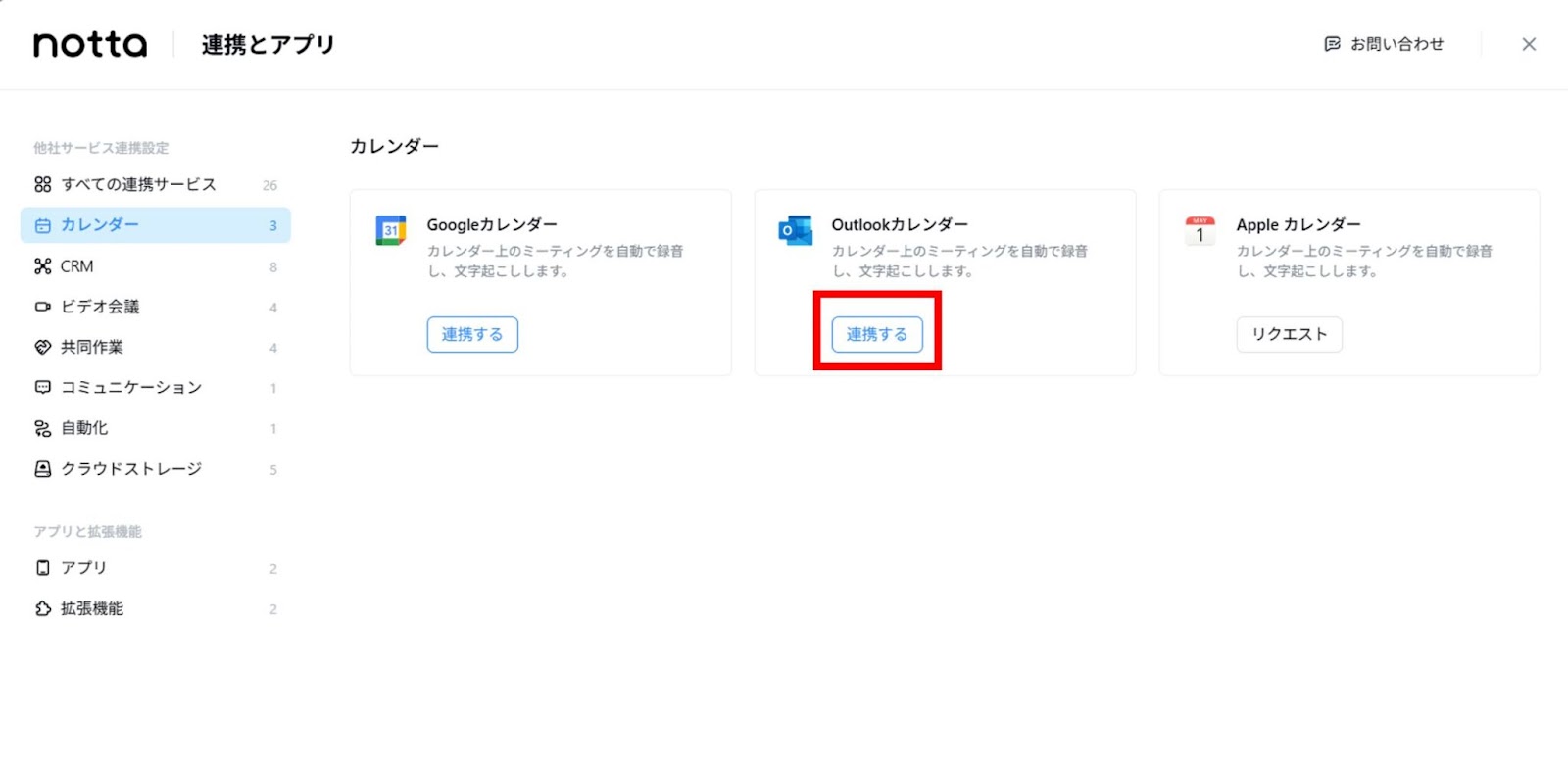 Nottaのダッシュボードから「連携とアプリ」をクリックします