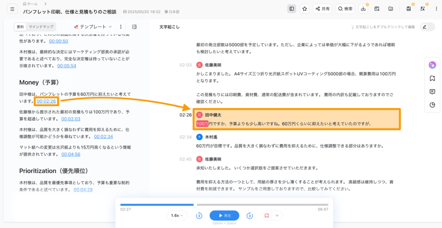 管理職として複数のプロジェクトを兼務していると、先月の定例会議の詳細までとっさに思い出せないこともありますが、そんな時でもNottaの要約を見て該当箇所をクリックすれば前後の音声を再生でき、文脈や声のトーンで一気に記憶がよみがえります。これはテキスト議事録だけでは不可能な体験ですね。
