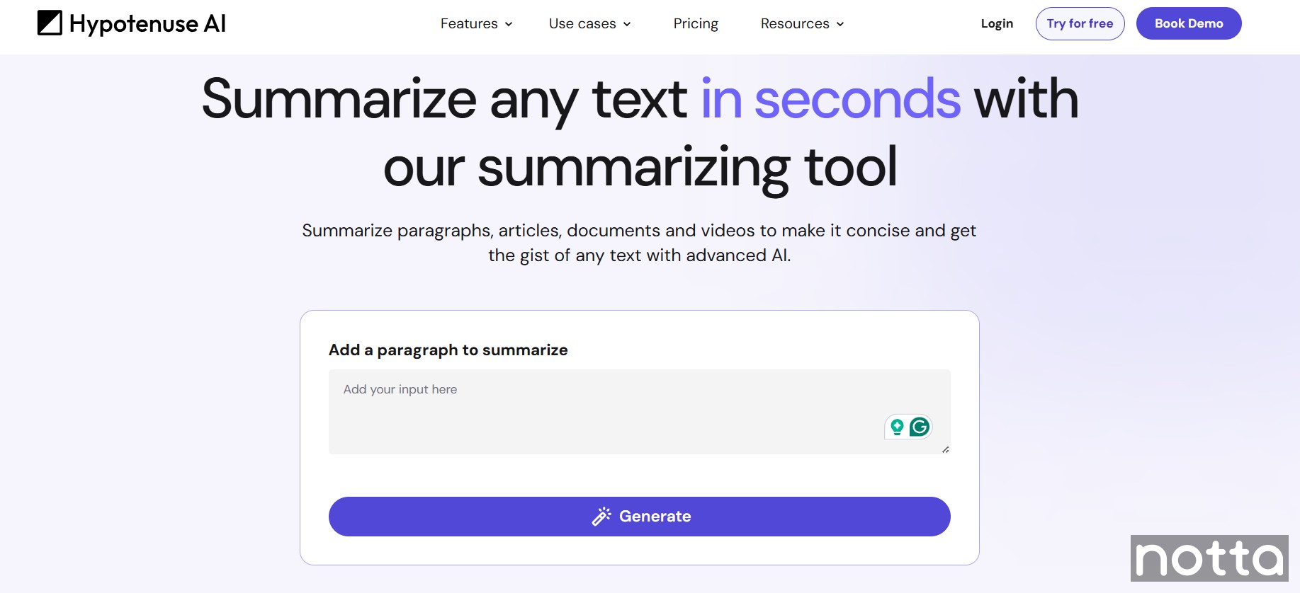 Hypotenuse AI is primarily an AI content platform for e-commerce and SEO teams, but it also includes a summarizing tool that works with PDFs. This feature lets you generate highlights of lengthy documents in either paragraph format or bullet points.