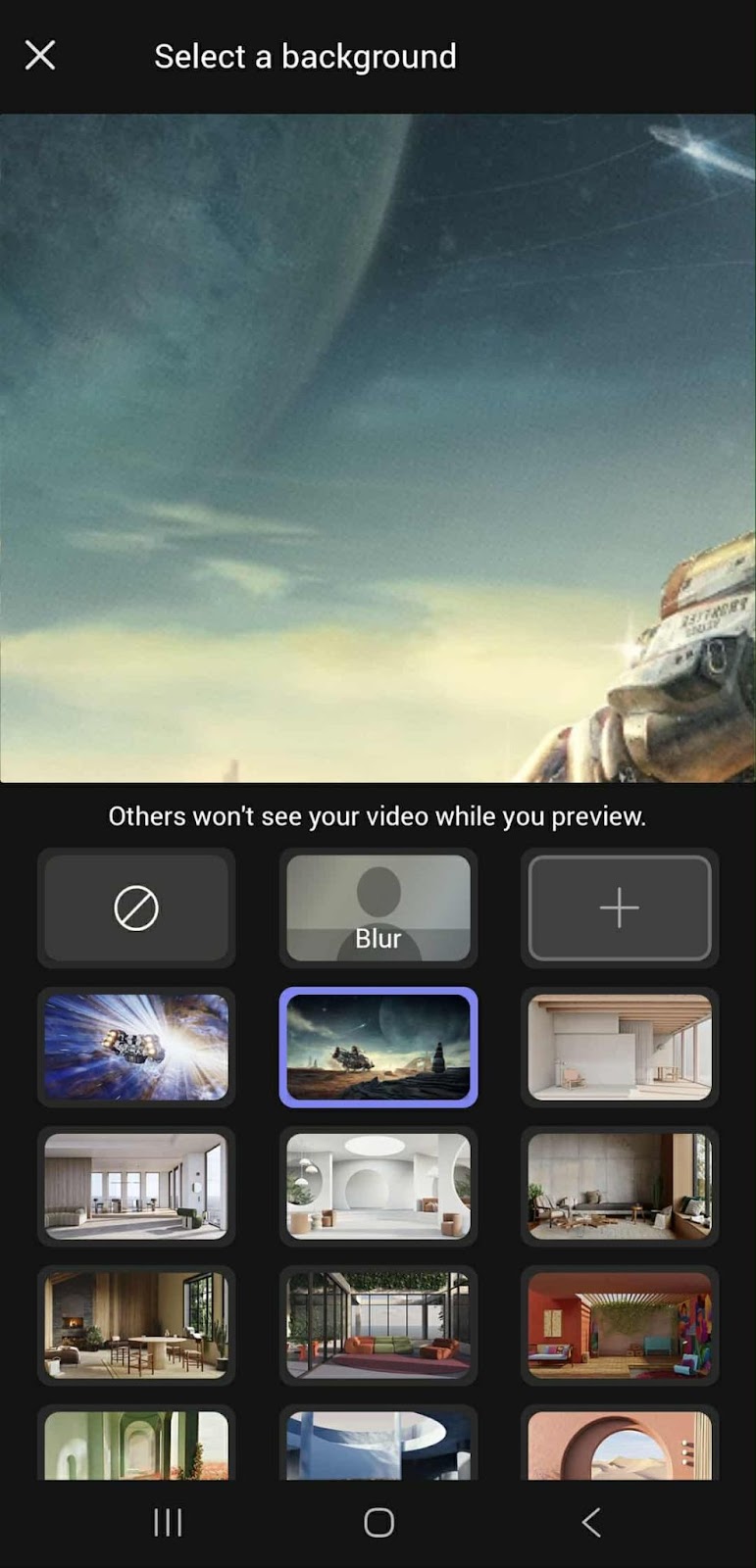 The ‘Background settings’ panel includes a collection of built-in backgrounds. Scroll through the images on the right side and select one to preview it behind you.