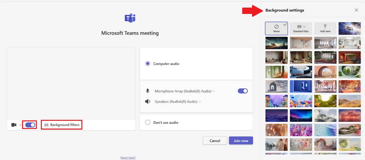On the pre-join screen, turn on your camera to see your video preview. At the bottom of the preview window, select ‘Background filters’. This opens the Background settings panel on the right side of the screen, where you can scroll through available backgrounds.