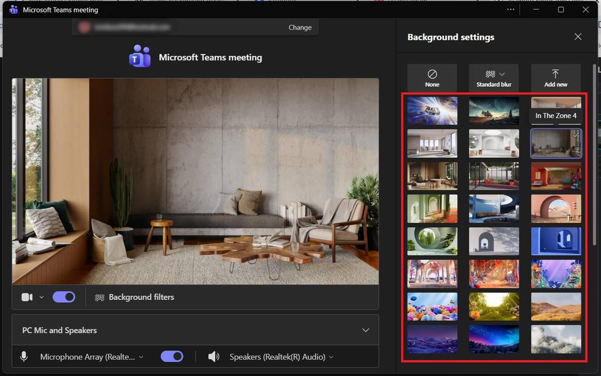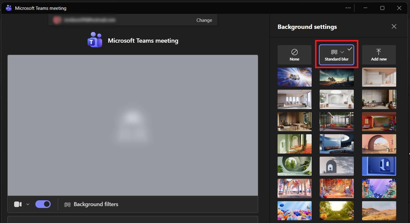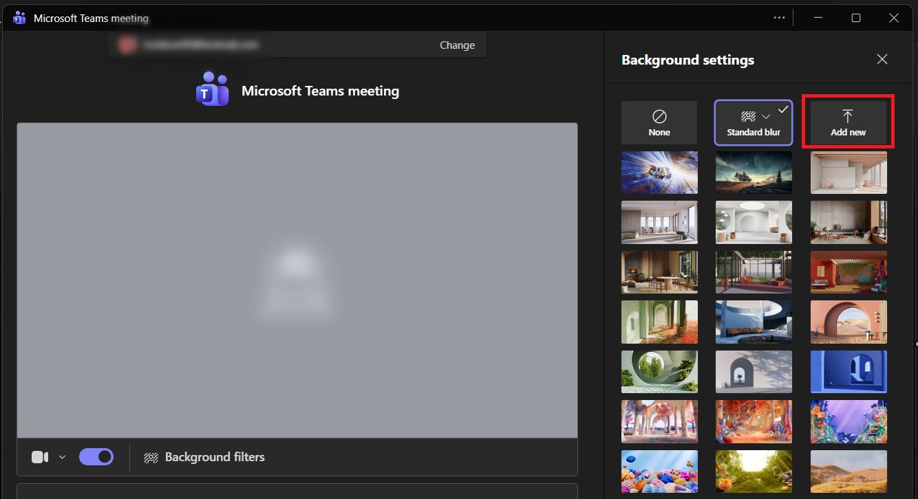 Scroll through the standard Teams backgrounds, select ‘Blur’ for a softer look, or choose ‘Add new’ if you want to upload an image from your device. The preview updates instantly, so you can see how each option looks.