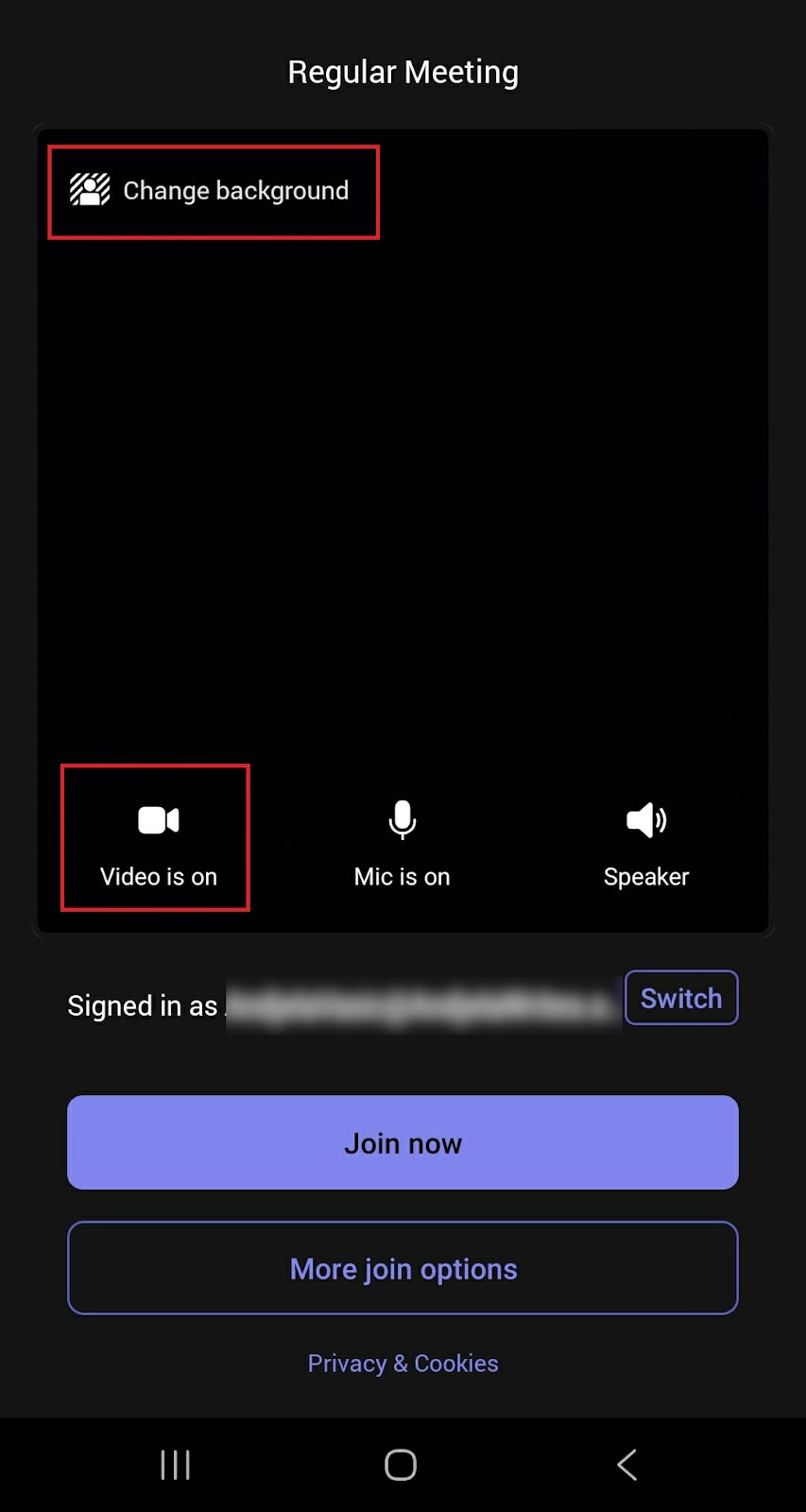 Open the Teams app and join your meeting, but stay on the pre-join screen. Turn on your camera to see your video preview. Tap the ‘Change background’ icon at the top of the screen to open the background panel.