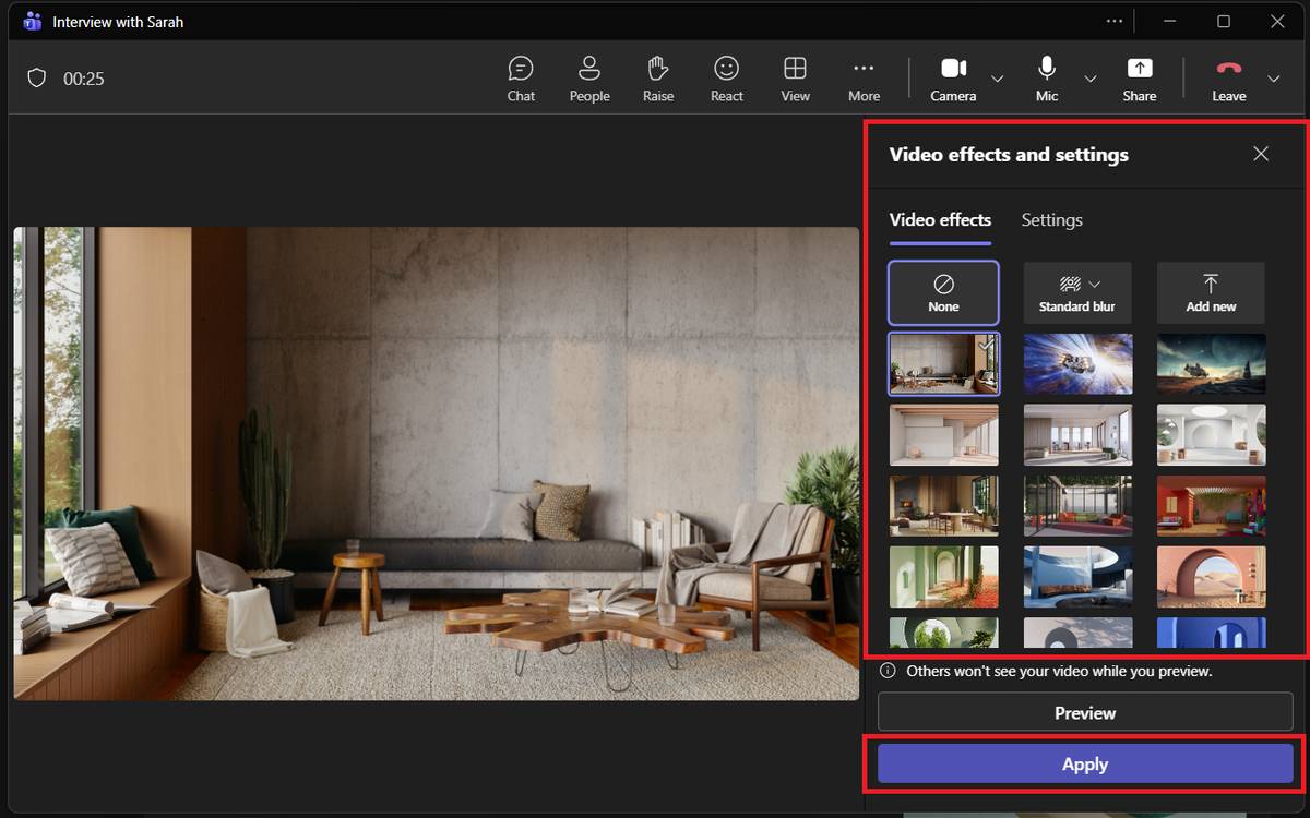 Teams applies the background right away, so you can decide whether it matches the tone of your call. If you want something clean and neutral, look for office or home-style scenes near the top of the gallery.
