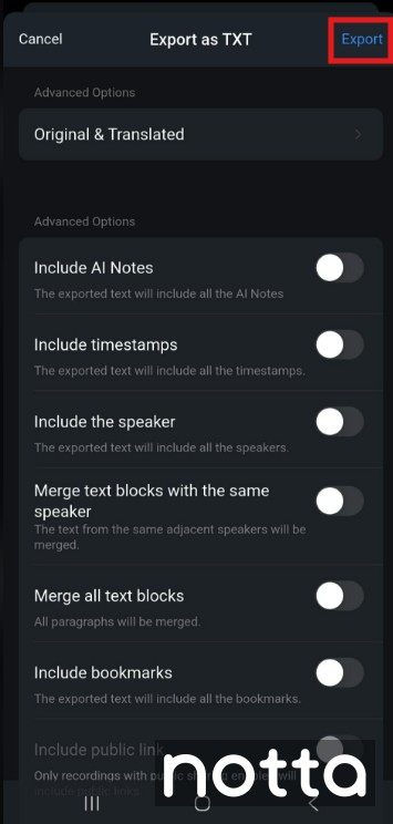 Step 3: In the advanced options, turn on the toggle next to what you want to export: timestamps, speaker names, bookmarks, etc. Finally, tap ‘Export’ in the top-right corner.