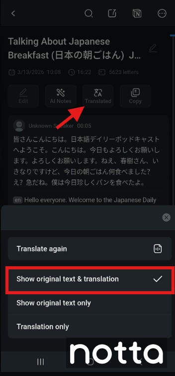 If you want to translate the transcript on mobile, you'll have to install the Notta Android or iOS app.