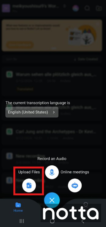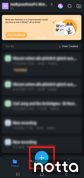 Step 1: First, head over to the Google Play Store on any Android device or App Store on iOS to download the Notta app. Create a Notta account and locate the ‘plus’ icon on the dashboard.