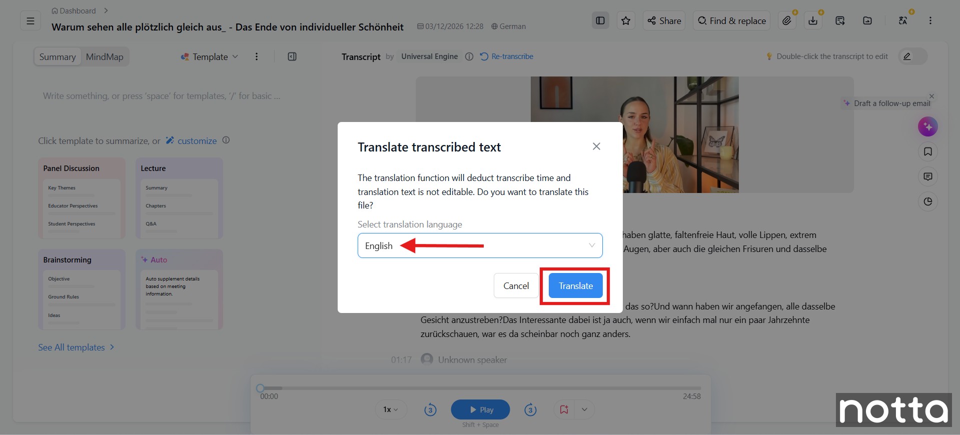 Step 3: Select the target language from the pop-up and click the blue ‘Translate’ button. Notta translation feature will translate the transcript in a few seconds or minutes (depending on the length and size of the file).