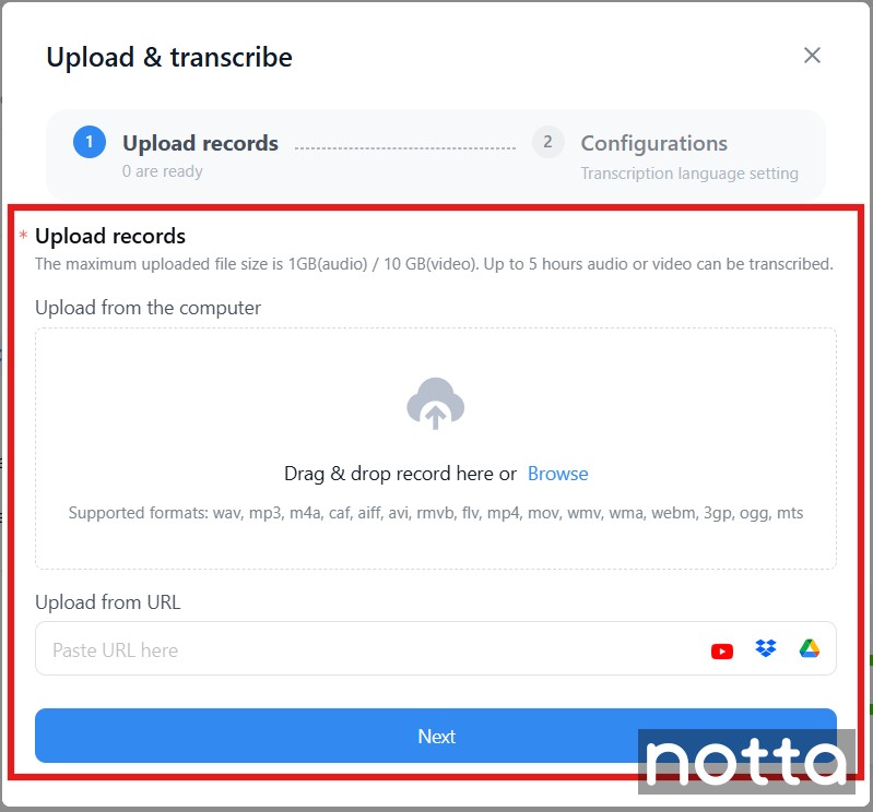 Step 1: Go to Notta's official website andcreate a new account. Sign in, then select the ‘Upload & transcribe’ option. Upload a local audio or video file by dragging and dropping it, or import one by pasting a Dropbox, Google Drive, or YouTube link. Choose the source language and click ‘Upload & transcribe,’ and Notta will generate a transcript of the file.