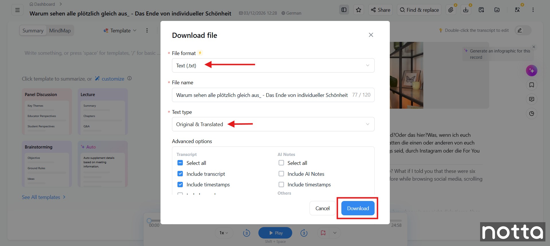 What I really find helpful is Notta's ability to export transcripts in many formats, like TXT, PDF, DOCX, and more. Here, I'll explain how to export transcripts in a few clicks (assuming you've already generated the transcript via the Notta Web App).