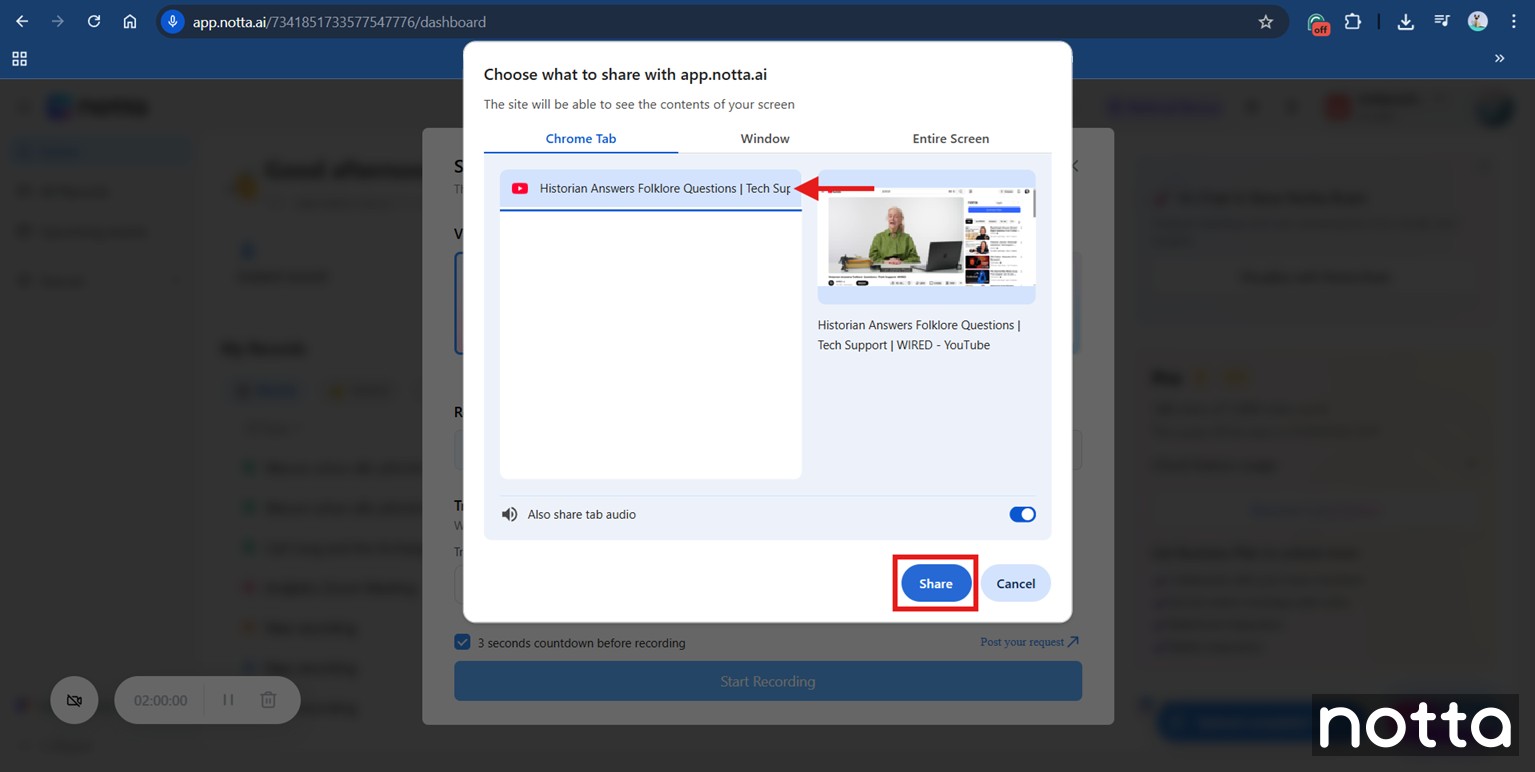 Step 3: Choose what you want to record: Chrome Tab, Window, or Entire Screen. For example, if you want to record an online lecture video on YouTube, select ‘Chrome Tab’, then ‘YouTube’, and hit the ‘Share’ button.