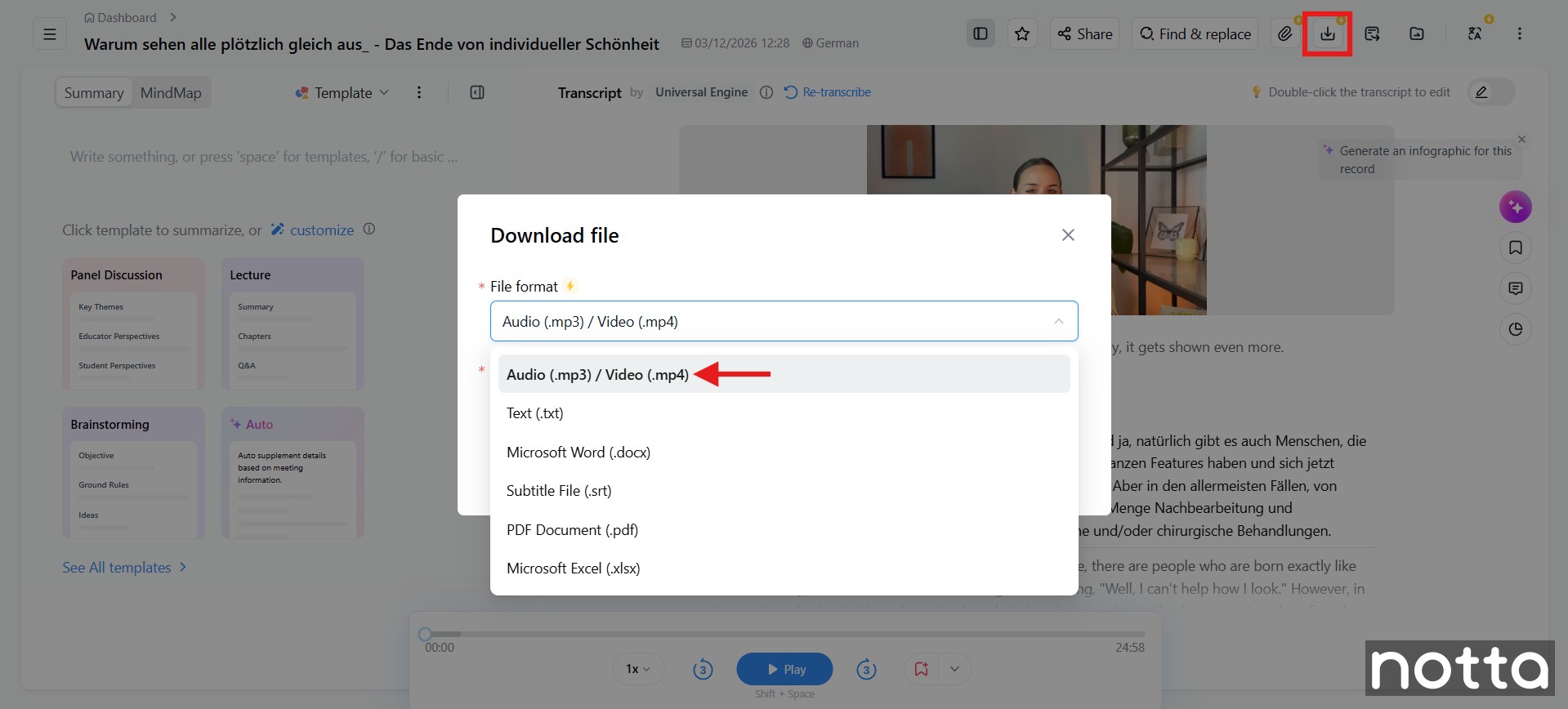 Claude's rec To export transcripts with Notta, open the transcript from your dashboard, click the ‘Export’ icon in the upper-right corner, select a file format (DOCX, PDF, TXT, SRT, or XLSX), and click ‘Download.’ The process takes under 30 seconds and works identically on the web app and mobile app.