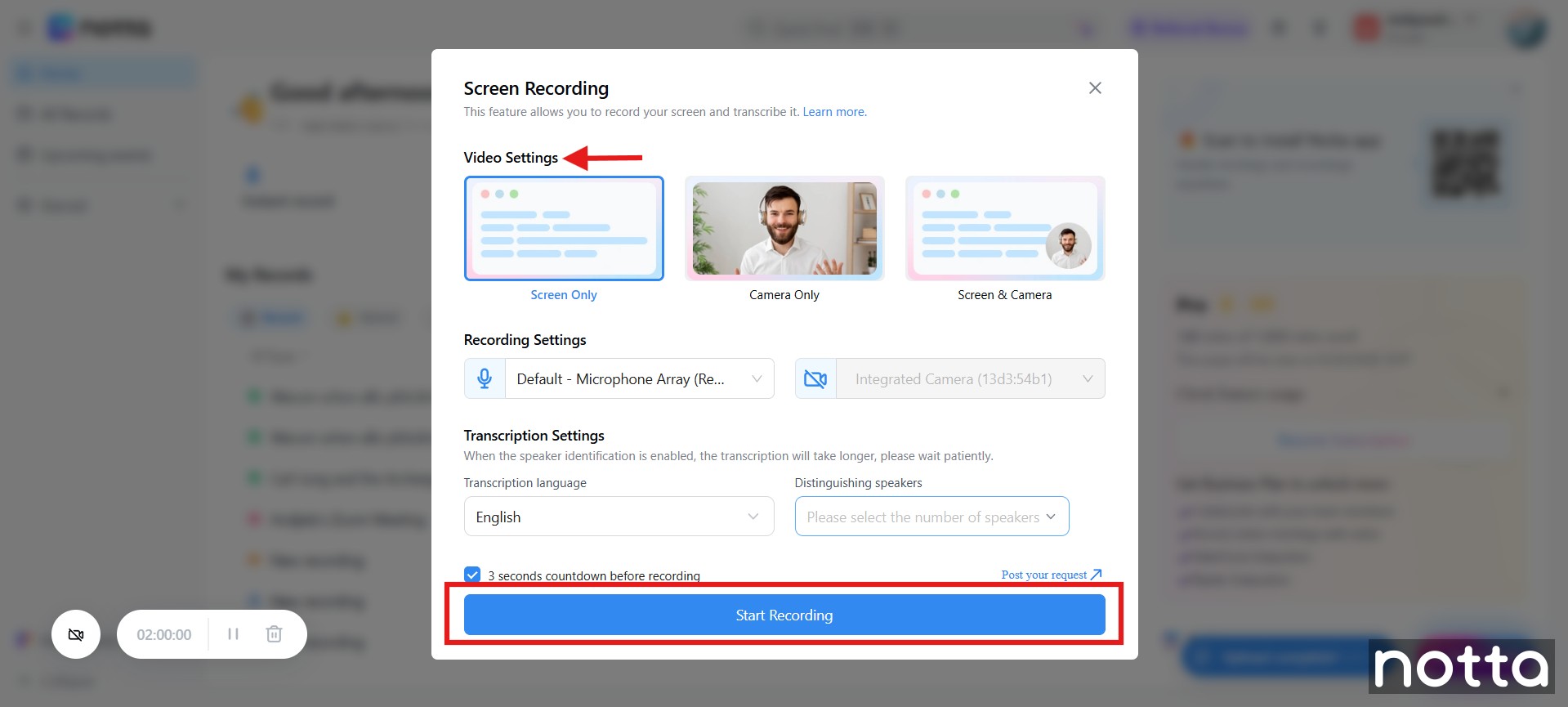 Step 2: You can select the video settings and choose what you want to capture: Screen Only, Camera Only, and Screen & Camera. Once done, select ‘Start Recording.’