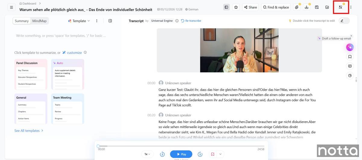 Notta will start recording and transcribing the spoken words in the ongoing video, which you can then access on the dashboard. You can view, edit, or share the generated transcripts with friends, colleagues, classmates, or team members.