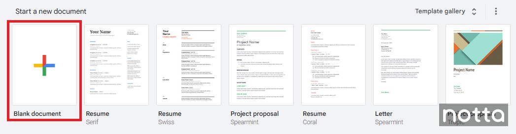 Open Google Docs and click 'Blank document' on the home page to start a new document.
