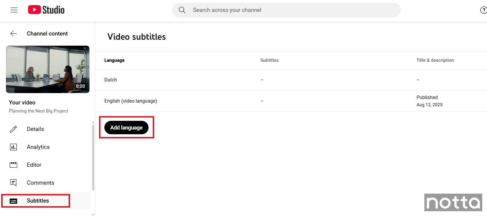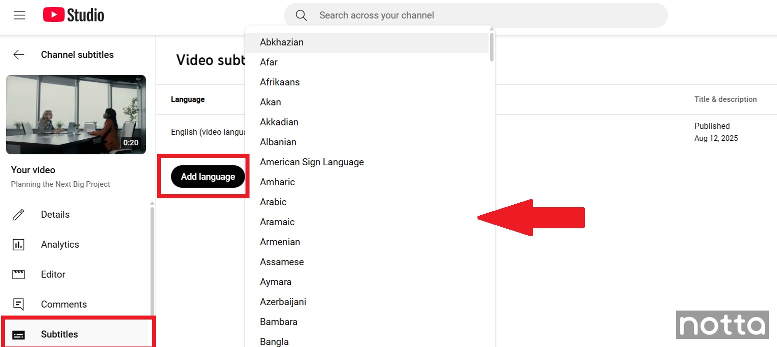 Note:You’ll need to have a file with subtitles in your preferred language saved on your device. If you don’t have one, you can use a third-partyAI translation tool likeNotta. It's pretty simple: upload the YouTube video link to Notta, and the AI tool will automatically transcribe the audio to text. You can then use Notta's translation feature to change the language of the transcript and save it as anSRT file.