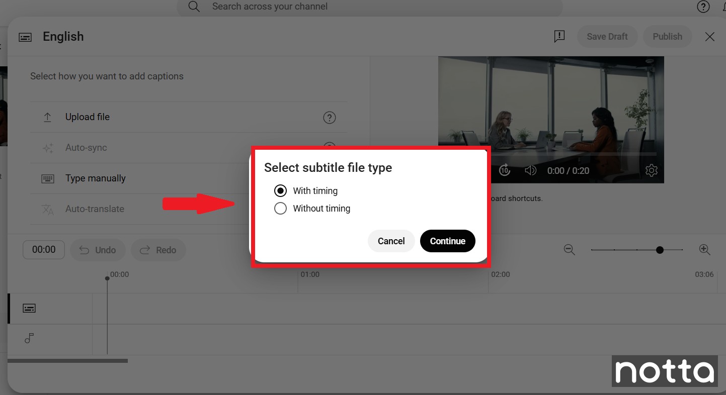 Step 4: If you're choosing the ‘Upload File’ option, you'll need to specify the exact timing of the YouTube subtitles. For this reason, select the ‘With timing’ option and click ‘Continue.’