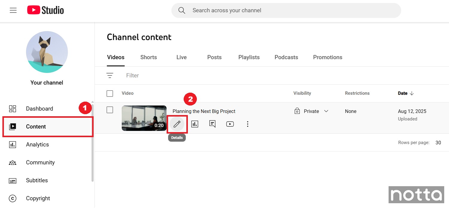 Step 1: Open YouTube and then select your profile picture in the top right corner of the YouTube screen. Go to YouTube Studio, and then select the ‘Content' option on the left dashboard of the screen. Hover over the video you want to translate and then click on the ‘Details’ option.
