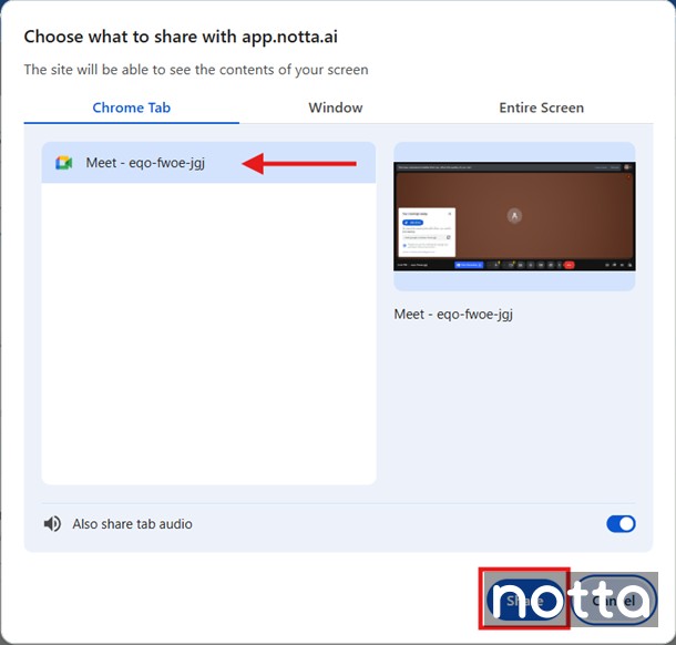 Select the tab with your Google Meet session and click 'Share'.