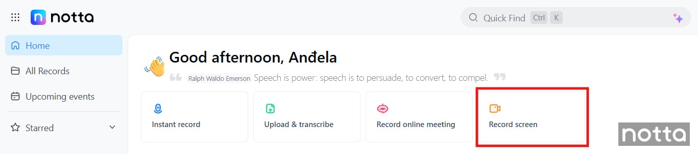 Go to the Notta dashboard and select 'Record screen' in the top action bar (far right option)