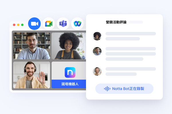 Notta bot 可加入 Zoom、Google Meet、Microsoft Teams、Webex 等會議,並即時生成逐字稿與摘要。